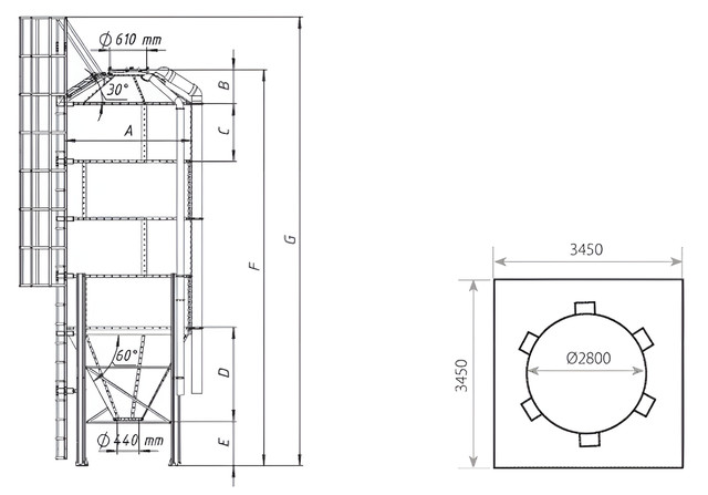 | Модель | Діаметр [м] (A) | Об’єм [м³] | Вміст корму [т]* | Кількість ніжок | B [мм] | C [мм] | D [мм] | E [мм] | F [мм] | G [мм] |
